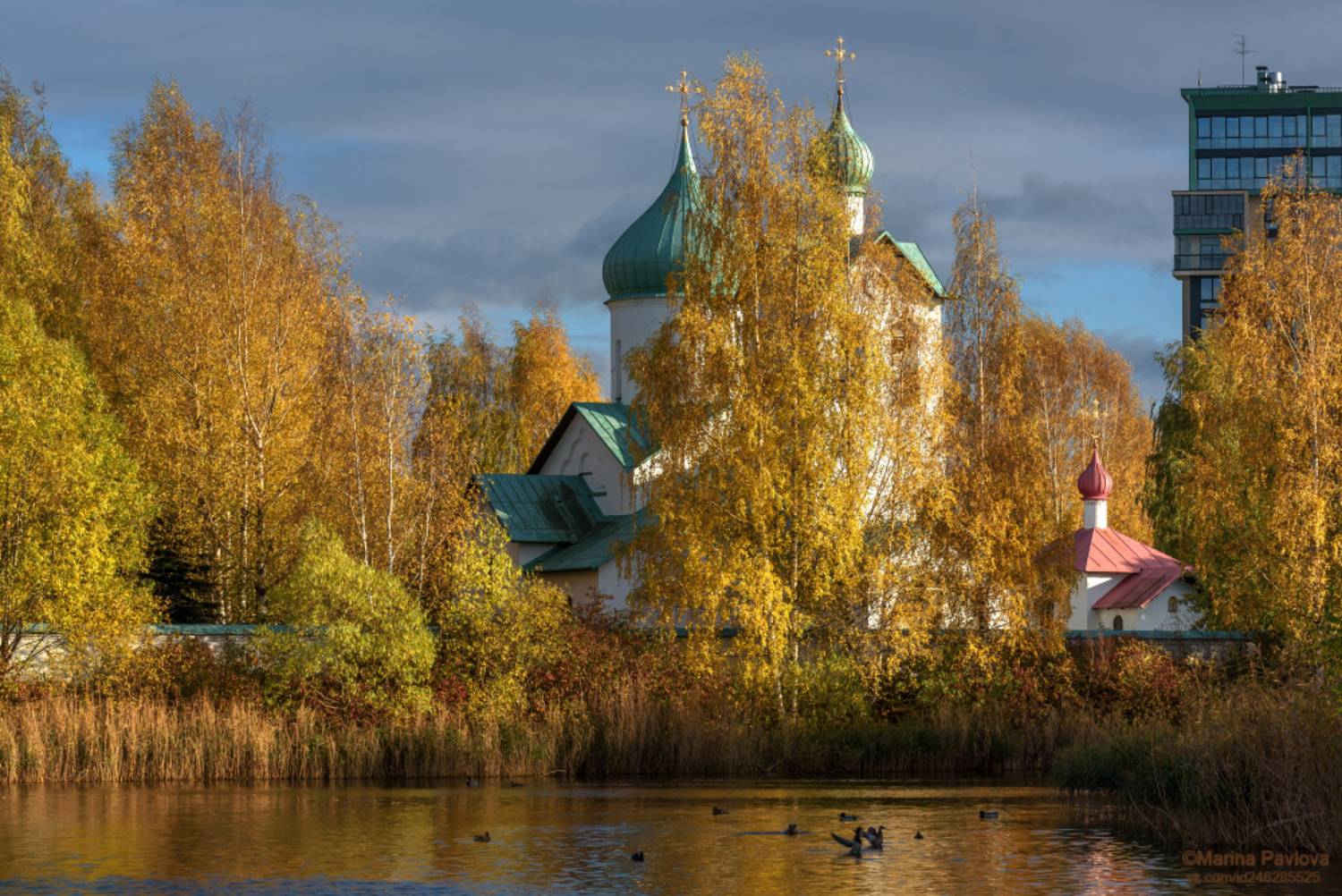 В восточной части парка, на берегу пруда, построен храмовый комплекс. Храм святого великомученика Георгия Победоносца стоит сразу на берегу, чуть в стороне находится храм Рождества Христова (голубые купола), храм Преподобного Сергия Радонежского и часовня Царственных Мучеников на островке в центре пруда.