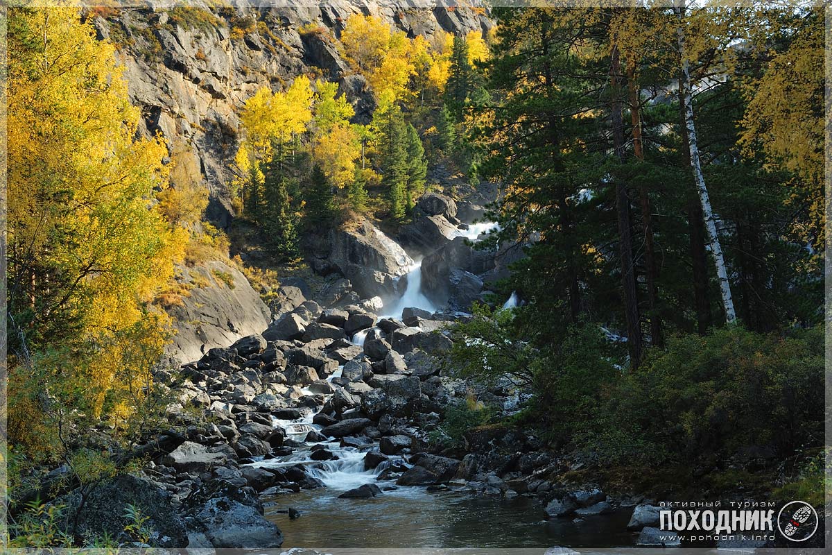 На снимке виден последний каскад 160-метрового водопада Учар (алт.: Могучий, Неприступный) - крупнейшего водопада на Алтае. Помимо его исключительной высоты, одной из его особенностей является то, что до сих пор не было сделано ни одного достойного снимка (вопрос спорный!), максимально достоверно передающего его высоту и мощь, из-за отсутствия выгодных точек съёмки. Но фотографы продолжают работать в этом направлении :)