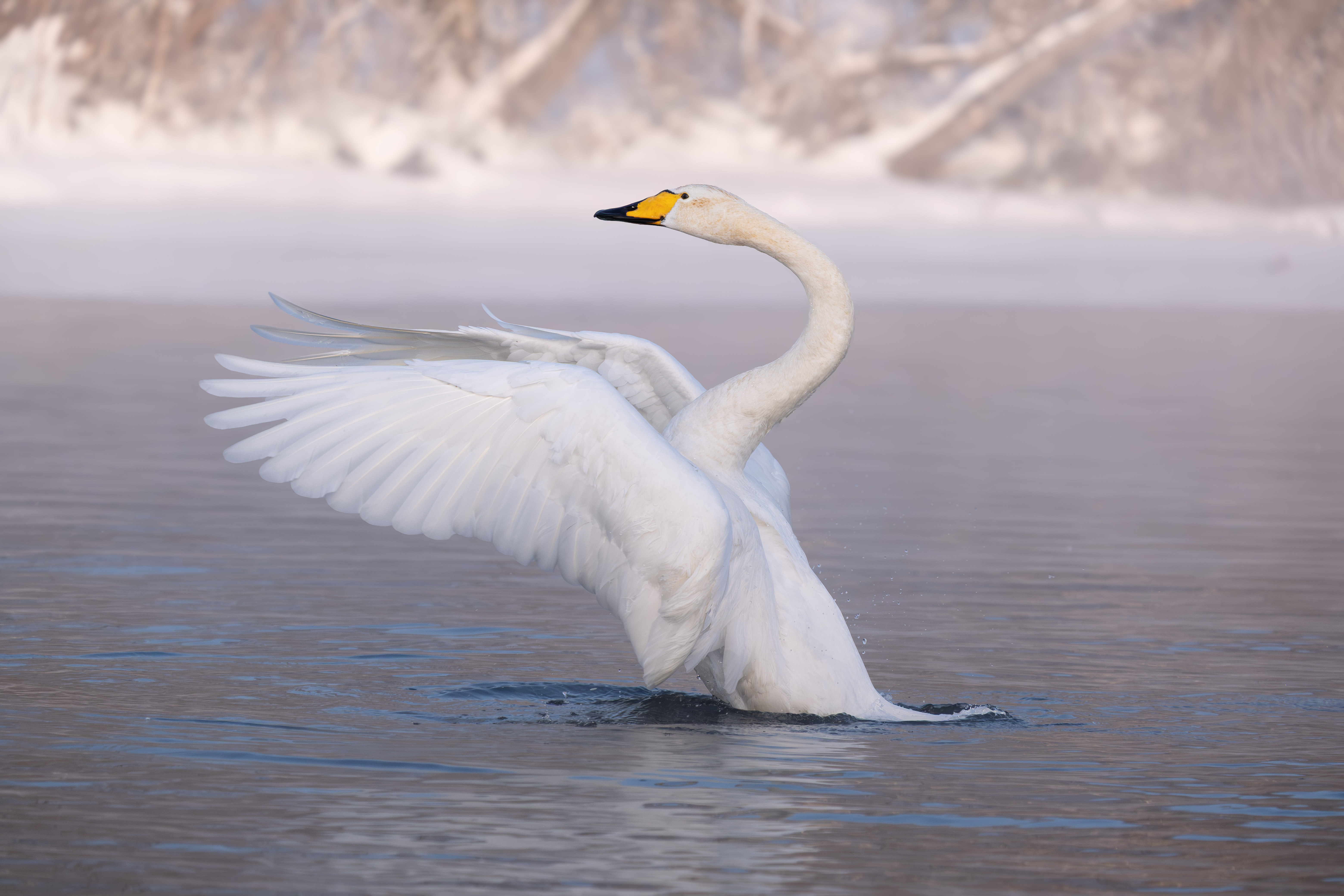 Крылья расправлены, вода отражает силуэт.