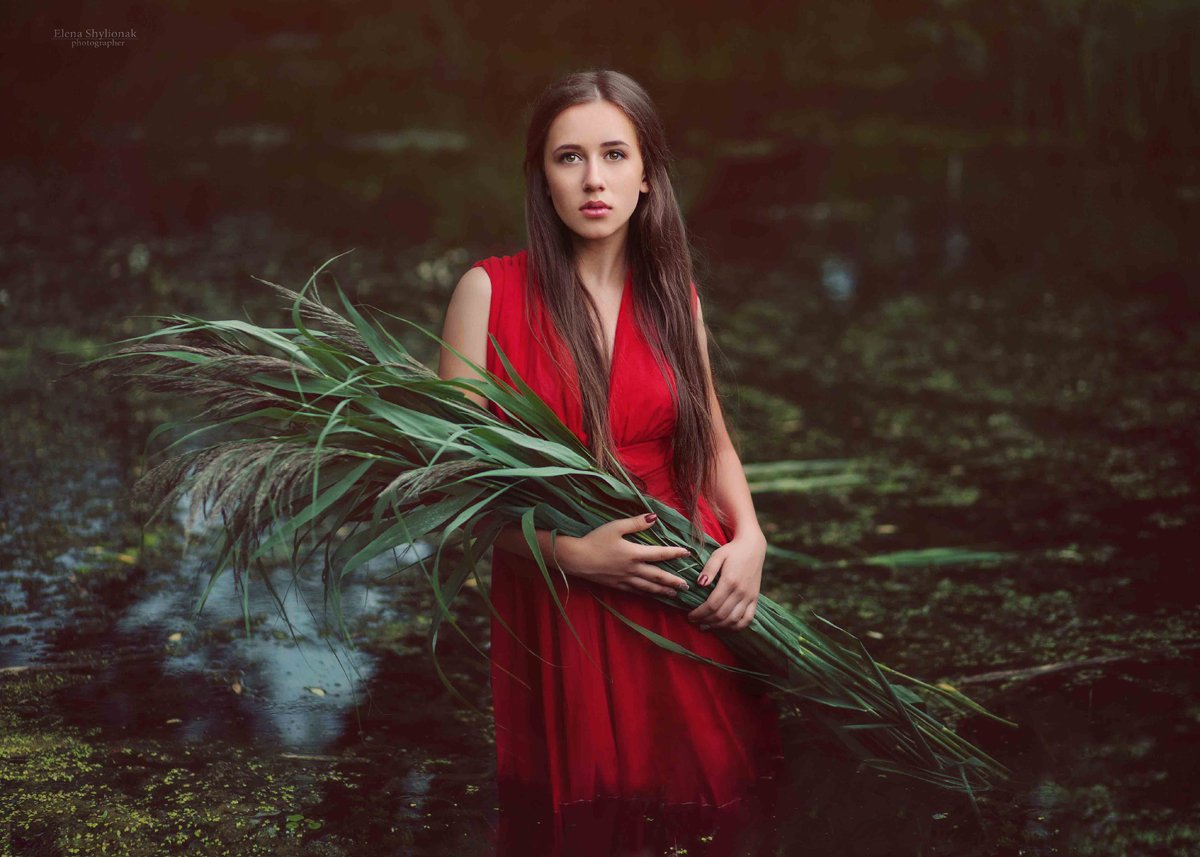 камыш, вода, девушка, красное платье, портрет девушки, Шиленок Елена