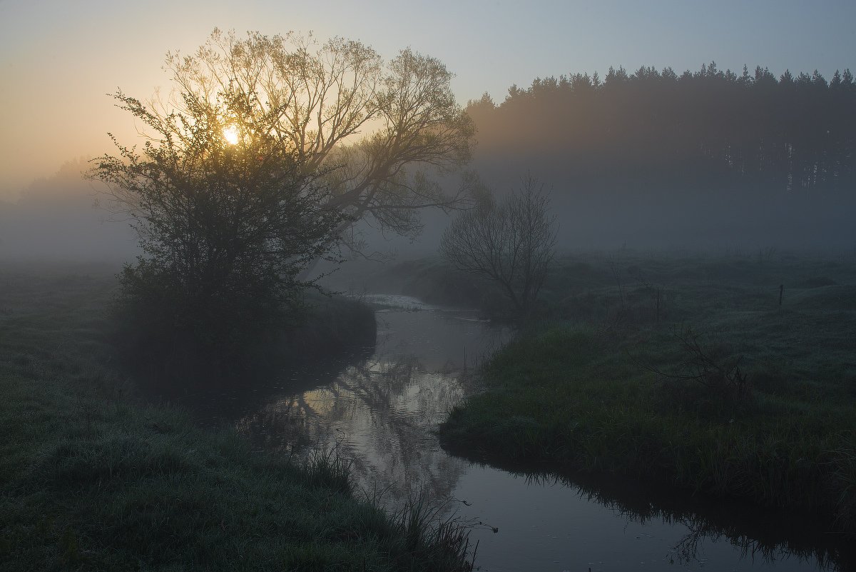 Апрель, Берег, Берега, Весна, Вода, Дерево, Отражения, Рассвет, Река, Ручей, Солнечное утро, Трава, Туман, Утро, Сергей Добровольский