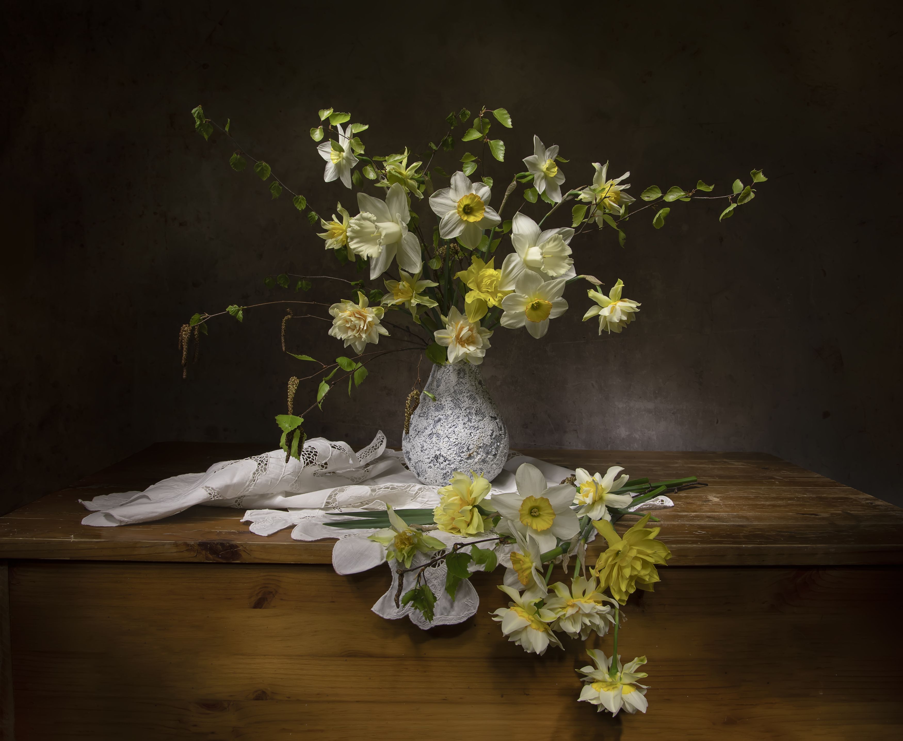 В тишине старого дома, на фоне потемневшей стены, раскрывается натюрморт — живое дыхание весны. Букет из белых и жёлтых нарциссов, словно только что срезанный, стоит в простой керамической вазе, а несколько цветов лежат на белой ткани, будто упавшие в нежной позе. Свет мягко ложится на деревянную поверхность, подчёркивая текстуру, тепло и уют. Это не просто композиция — это мгновение, когда природа входит в дом, наполняя его свежестью и тишиной. Фотография Татьяны Феденковой захватывает суть — простота, красота и гармония.